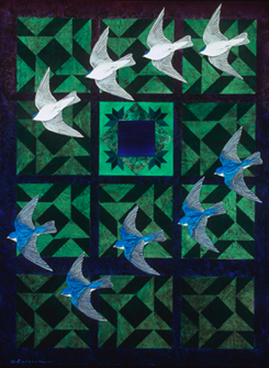 Radeaux paints the fauna of his native Colorado. The life sized images of birds and other animals are not merely idealized illustrations but explore the patterning and geometrics found in nature. Spatial relationships and comparison to stylized depictions of nature from various cultures are also part of this art. It is a style that is unique to Radeaux, a combination of detail and restraint, repetition and rhythm.