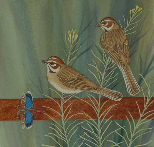 Lark Sparrows & Blue-winged Grasshopper 11"x11"